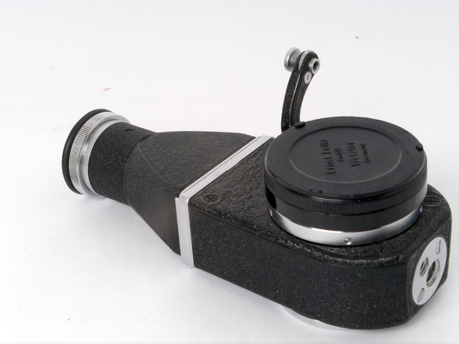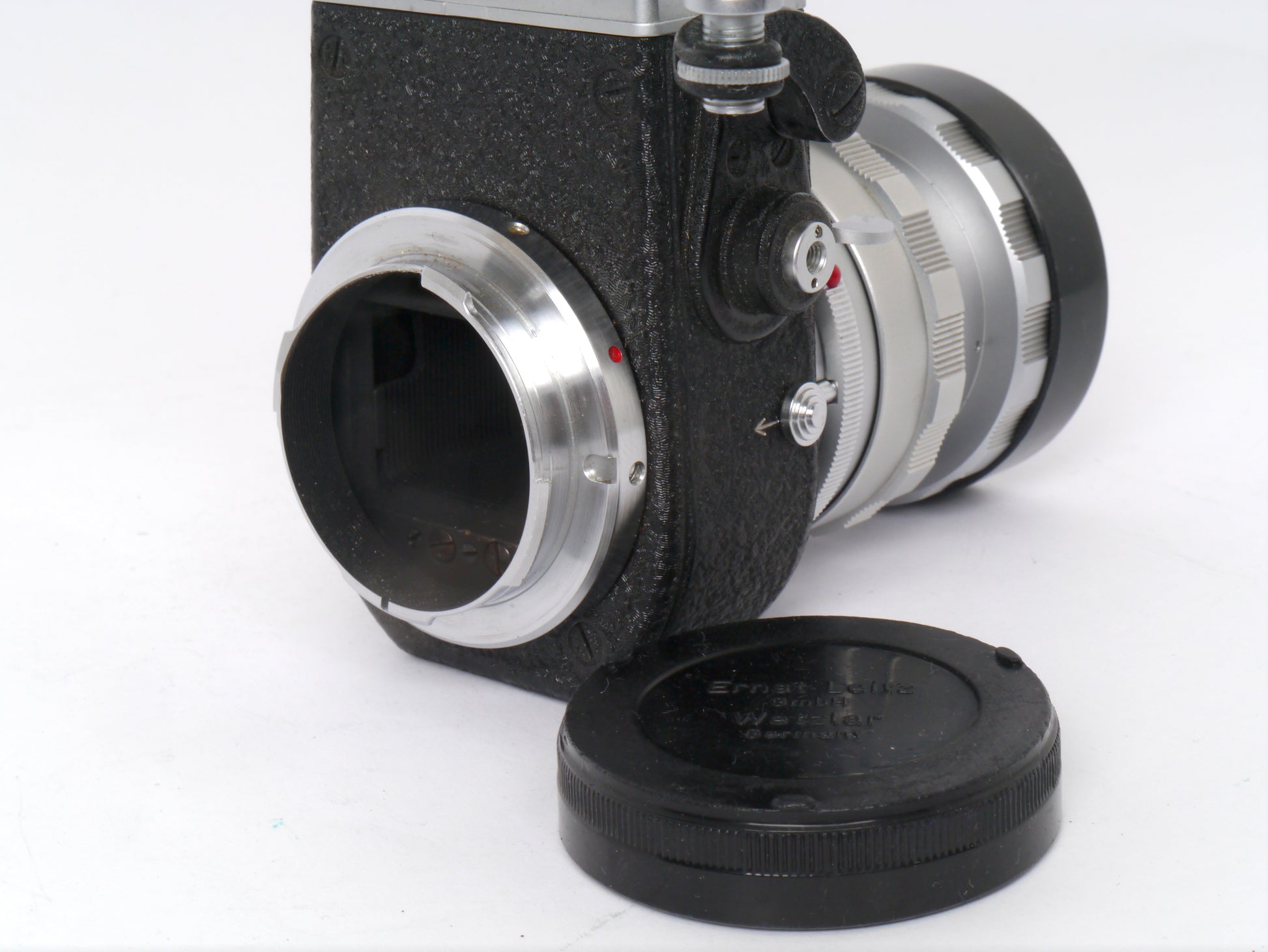 Leica Elmar 3,5/65 mm chrom mit Einstellschnecke Art. 16464 und Visoflex II mit 90° Lupe Art. OTVXO / 16461 – sehr guter Zustand